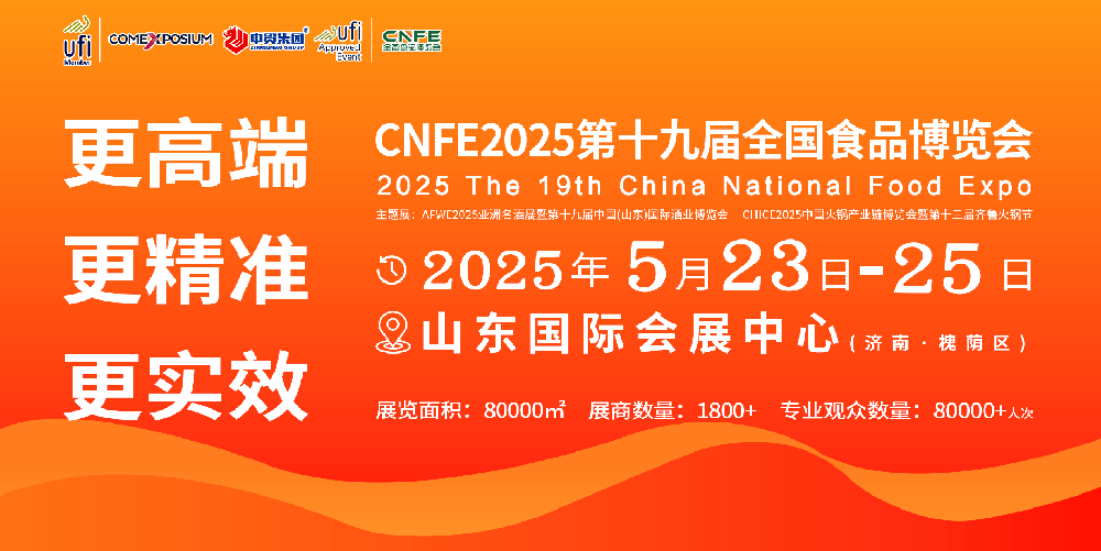 CNFE2025第十九屆全國食品博覽會檔期確定!CNFE2025第十九屆全國食品博覽會,將于2025年5月23-25日在濟南市山東國際會展中心(濟南市槐蔭區(qū))舉···